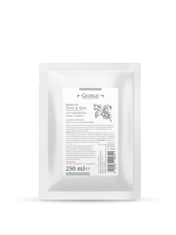 Bende monouso imbibite di morbido siero-gel ideale per il trattamento dei soggetti con cellulite e/o adipe: la formula innovativa sfrutta la sinergia di attivi preziosi quali Fosfatidilcolina, Glucosammina Solfato (precursore dell’Acido Ialuronico), con Escina, Caffeina ed Estratto di Centella.